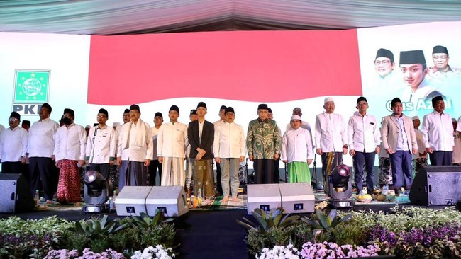 "Terima kasih atas kehadiran para Kiai, para ulama, para guru dan seluruh jemaah khususnya Kiai Said dan Gus Azmi malam ini memeriahkan di kantor kita tercinta ini," tutur Cak Imin.