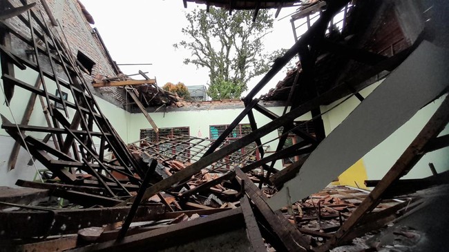 "Jadi sekarang ambruk semua, termasuk genting dan kayu-kayu atas. Semuanya ambruk. Kejadian ini tentunya memperparah kerusakan yang kemarin. Ambruk semua atapnya," tambahnya.