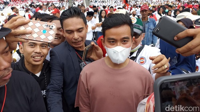 Pantauan detikcom di lokasi, Sabtu (27/11/2022), terlihat Gibran mengenakan kaus berwarna merah muda. Gibran terlihat turun dari tribun dan menghampiri para relawan yang berada di bawah. Hal tersebut sontak disambut riuh para relawan sembari meminta foto.