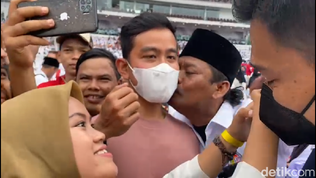 "Ora (tidak minta maaf), awale aku mlaku (awalnya saya berjalan) sepanjang GBK. Terus ada salaman, ada yang minta foto, karo pak e kui (bapaknya yang mencium) yo rodok unik (sedikit unik)," ujar Gibran.