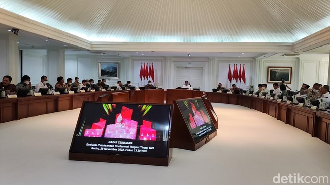 Presiden Joko Widodo (Jokowi) menggelar rapat terbatas bersama para menteri dan kepala lembaga. Rapat terbatas ini digelar untuk mengevaluasi pelaksanaan KTT G20 di Bali.