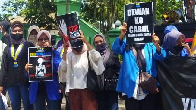 "Lawan segala bentuk penindasan dan pelecehan terhadap perempuan. Tindak tegas oknum anggota DPRD Pandeglang inisial Y," seru mahasiswa dalam orasinya.