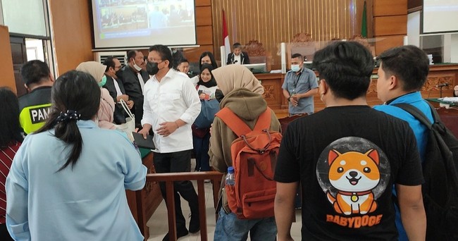 Perempuan itu mengenakan kaus putih bergambar foto Sambo. Dia bergerak menghampiri Sambo di area steril yang hanya bisa dimasuki jaksa, pengacara, terdakwa, dan majelis hakim. Dia masuk setelah hakim keluar dari ruang sidang.