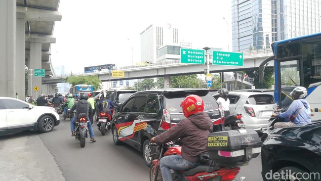 Hingga di flyover Pancoran, volume kendaraan pun tampak masih padat. Kemacetan itu terjadi hingga Jalan Gatot Subroto menjelang flyover simpang Jalan HR Rasuna Said Kuningan, Jaksel.