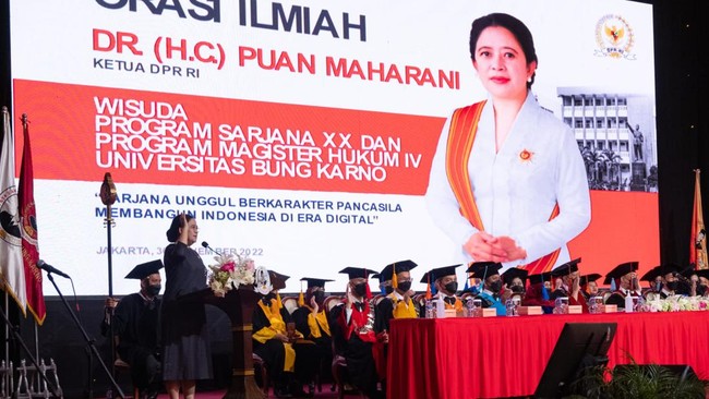 Ketua DPR RI Puan Maharani mengisi orasi ilmiah dengan tema 'Sarjana Unggul Berkarakter Pancasila Membangun Indonesia di Era Digital' dalam acara wisuda Universitas Bung Karno (UBK) hari ini. Dalam kesempatan itu, ia mengajak para wisudawan/wisudawati untuk berpartisipasi membangun Indonesia.