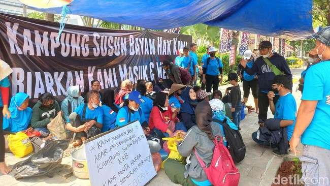 Warga Kampung Bayam menggelar aksi di Balai Kota DKI Jakarta. Mereka menuntut PT Jakarta Propertindo (JakPro) segera menyerahkan kunci hunian Kampung Susun Bayam (KSB).