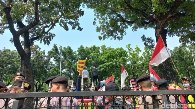 Mereka tampak membawa sejumlah atribut seperti spanduk dan bendera Indonesia. Massa mengatasnamakan Gerakan Aktivis Mahasiswa Islam Indonesia.