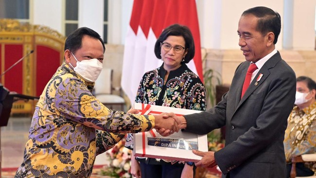 Menteri Dalam Negeri (Mendagri) Muhammad Tito Karnavian menerima Daftar Isian Pelaksanaan Anggaran (DIPA) Kementerian Dalam Negeri (Kemendagri) Tahun Anggaran (TA) 2023 dari Presiden Joko Widodo di Istana Negara, Jakarta, hari ini. Kemendagri merupakan satu dari 14 kementerian/lembaga yang menerima DIPA TA 2023 secara langsung dari presiden.