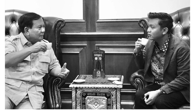 Dalam unggahan itu, Prabowo tampak mengenakan kemeja safari, sedangkan Denny Caknan mengenakan batik dibalut dengan jas. Keduanya tampak semringah menikmati kopi dan berbincang.