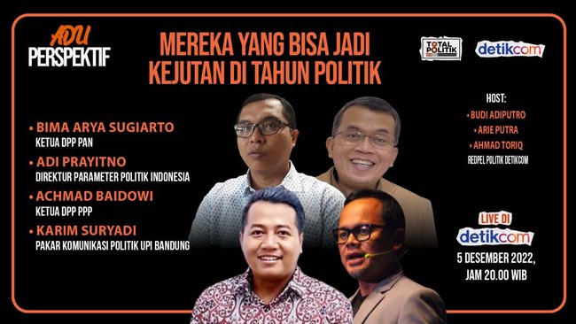 Menghadirkan narasumber Bima Arya (Ketua DPP PAN), Adi Prayitno (Direktur Eksekutif PPI), Dave Laksono (Politikus Golkar), Achmad Baidowi (Politikus PPP) dan Karim Suryadi (Guru Besar Komunikasi Politik UPI Prof), saksikan Adu Perspektif dengan topik "Mereka yang Bisa Jadi Kejutan di Tahun Politik" secara langsung dari kanal detikcom dan 20detik, Senin 5 Desember 2022 pukul 20.00.