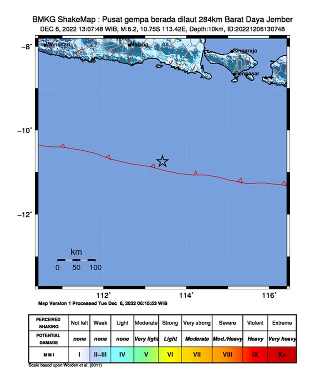 Titik gempa pertama itu berada di koordinat 10,75 derajat Lintang Selatan (LS) dan 113,42 derajat Bujur Timur (BT). Pusat gempa berada di 284 km arah barat daya Jember dan berada di laut pada kedalaman 10 km.