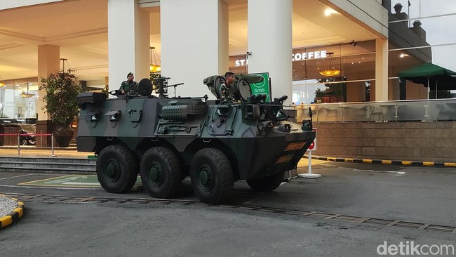 Pantauan detikcom di Royal Ambarrukmo, pada pukul 17.40 WIB, Rabu (7/12/2022), kendaraan tempur (ranpur) buatan Pindad, Panser Anoa, dan kendaraan taktis (rantis) Komodo telah bersiaga di kawasan Pendopo.