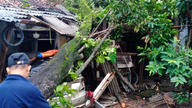 Selain sempat menutup jalan, pohon tersebut juga menimpa salah satu rumah warga. Pohon tumbang juga menimpa mobil di depan rumah warga.