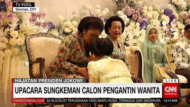 Erina yang berkebaya hijau dipadukan dengan jarik cokelat tampak bersimpuh di bawah sungkem kepada GKR Hemas dan KGBRAy Atika Purnomowati yang duduk di samping ibunda Erina.