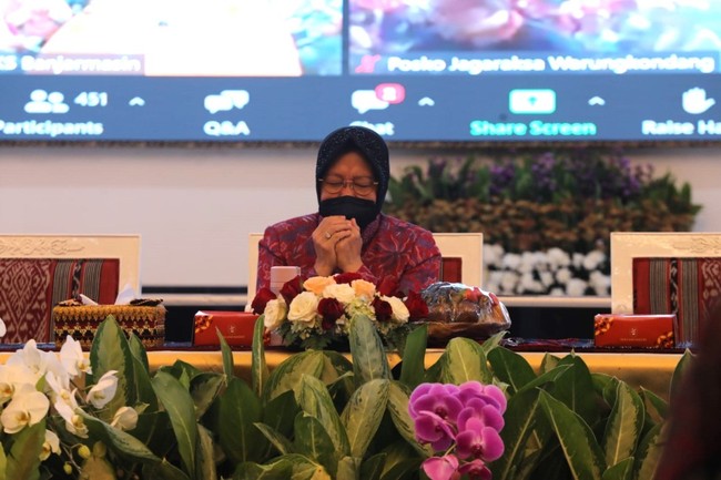 Menteri Sosial Tri Rismaharini menggelar doa bersama untuk keselamatan bangsa di Jakarta, hari ini. Doa bersama yang diselenggarakan secara hybrid ini diikuti oleh pejabat serta pegawai Kemensos, relawan, dan penyintas gempa bumi Cianjur.