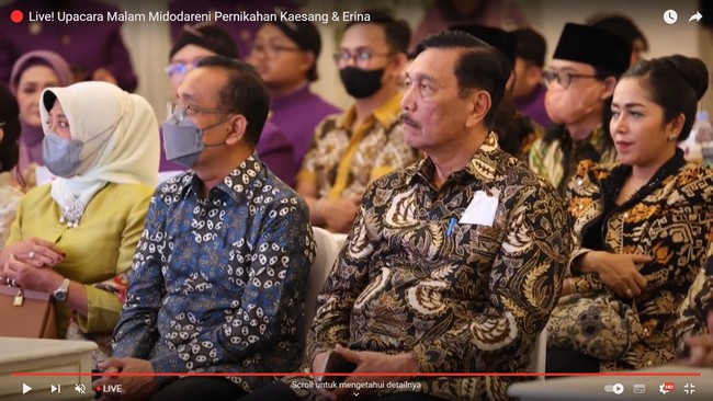 Putra Presiden Joko Widodo (Jokowi), Kaesang Pangarep, menjalani prosesi malam midodareni di rumah calon istrinya, Erina Gudono. Sejumlah menteri Kabinet Indonesia Maju pun hadir.