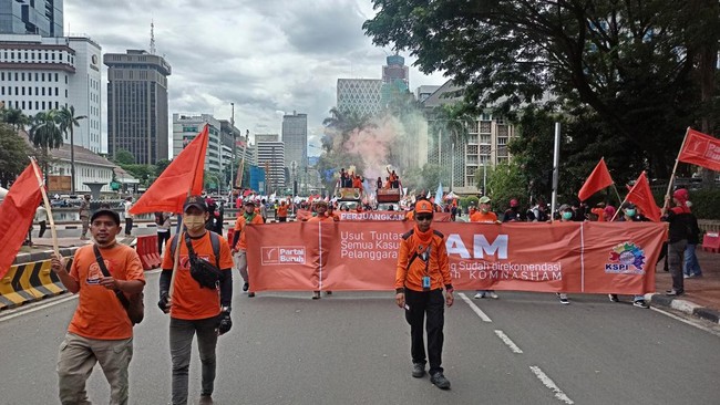 "Usut tuntas semua kasus pelanggaran HAM yang sudah direkomendasikan oleh Komnas HAM," demikian tertulis dalam spanduk protes yang dibawa buruh.