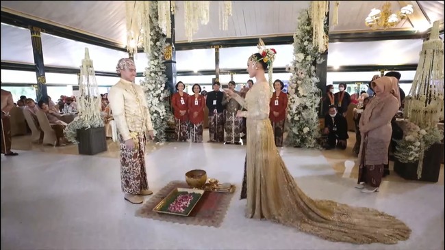 Putra Presiden Joko Widodo (Jokowi), Kaesang Pangarep, dan istrinya Erina Gudono menjalani prosesi panggih adat Yogyakarta. Prosesi mulai dari balangan gantal hingga cuci kaki dijalankan.