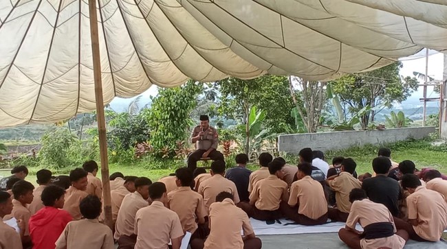 Polisi menghadiri latihan dasar kepemimpinan siswa (LDKS) salah satu SMK di Kecamatan Cibinong, Kabupaten Bogor, Jawa Barat. Kegiatan tersebut dihadiri oleh 100 pelajar.