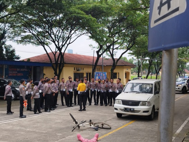 Adegan tersebut rupanya bagian dari pelatihan analisis kecelakaan lalu lintas yang sedang diajarkan dengan metode praktik kepada peserta didik Pusdik Lantas Polri yang datang dari berbagai polda di Indonesia.
