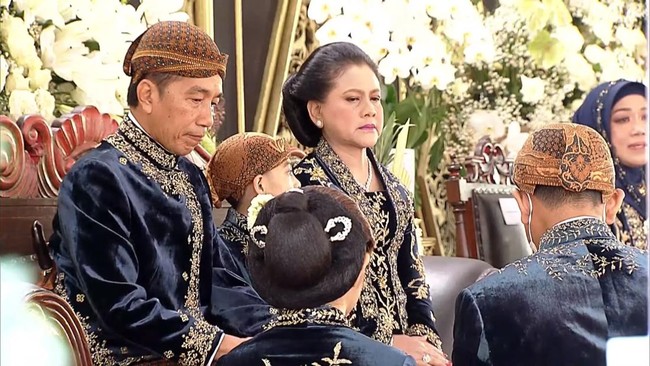 Prosesi itu dilakukan usai anak dan menantu Jokowi sungkem kepada keduanya. Gibran yang mewakili adik-adiknya kemudian meminta tuntunan dari Jokowi untuk anak-anaknya, terutama Kaesang yang baru saja menikahi Erina pada Sabtu (10/12).