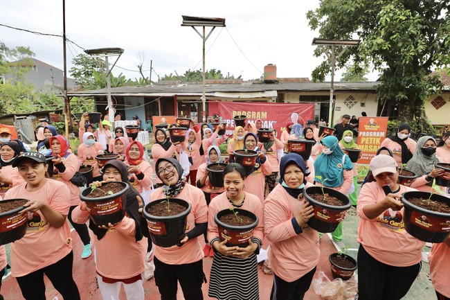 Relawan Mak Ganjar menggelar program 'Petik Masak' dengan membagikan 500 pohon cabai lengkap dengan media tanam, pot, dan bibit cabai ke rumah-rumah warga di Ciracas, Jakarta Timur, Minggu (11/12).