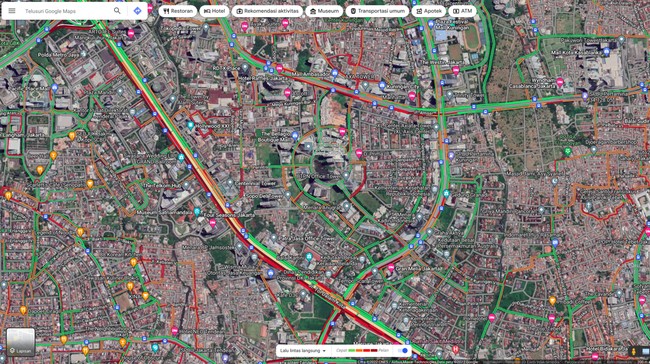 Dilihat dari Google Maps, Kamis (15/12/2022) sekitar pukul 12.24 WIB, kemacetan terjadi di ruas Tol Dalam Kota dari arah Cawang ke Semanggi. Kemacetan juga terjadi di ruas Jalan Kapten Tendean yang mengarah ke Kuningan.