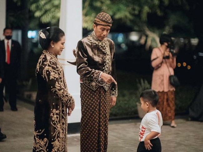 Dalam foto tersebut, terlihat istri Jokowi Iriana tersenyum kala melihat suaminya sedang menasehati cucunya. Foto tersebut diperkirakan diambil dalam rangkaian pernikahan Kaesang dan Erina.