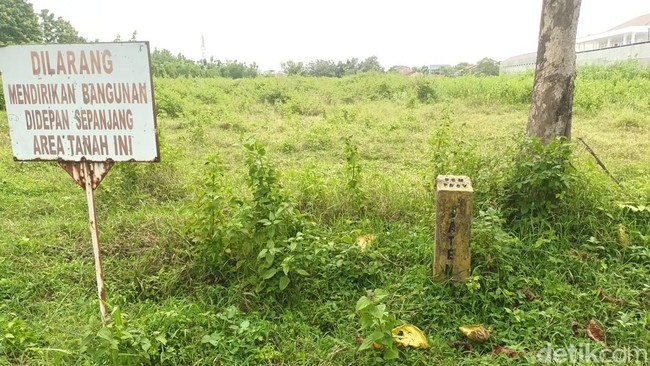 Pada lahan tersebut, terdapat plang bertulisan 'Dilarang Mendirikan Bangunan Didepan Sepanjang Area Tanah Ini'. Di samping tulisan itu, terdapat patok berwarna kuning, dengan samar bertulisan 'Pemprov Jateng'.