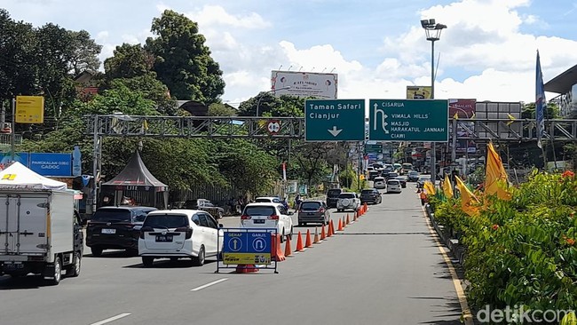 Antrean kendaraan arah Cisarua maupun arah Jakarta tampak mengular panjang. Polisi melakukan pengaturan dengan memasang pembatas agar tidak ada pengendara melambung.