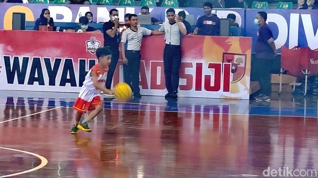 Cucu pertama Presiden Joko Widodo (Jokowi), Jan Ethes Srinarendra, mengikuti exhibition bola basket Liga Solo bank BJB di Gor Sritex Arena untuk kelompok umur 8 tahun. Kelucuan Jan Ethes tampak saat mengaku bingung memasukkan bola.