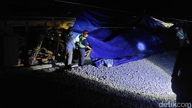 Berdasarkan pantauan detikJabar di lokasi kejadian, kereta teknis berwarna kuning dengan ukuran panjang dan cukup besar didorong oleh sebuah lokomotif berwarna hijau bertuliskan Power China di bagian depan keluar dari lintasan kereta.