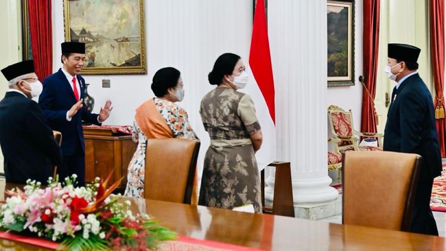 Dalam salah satu foto dari Biro Pers Sekretariat Presiden, terekam momen hangat Prabowo bersama Jokowi, Wakil Presiden Ma'ruf Amin, Megawati, dan Ketua DPR RI Puan Maharani. Prabowo, yang mengenakan masker, saat itu berdiri menghadap Jokowi.