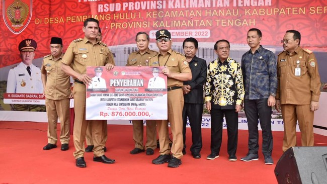 Adapun penyerahan dilakukan secara simbolis bertepatan dengan kegiatan pemancangan tiang perdana pembangunan RSUD Provinsi Kalteng di Desa Pembuang Hulu I, Kecamatan Hanau, Kabupaten Seruyan, kemarin.
