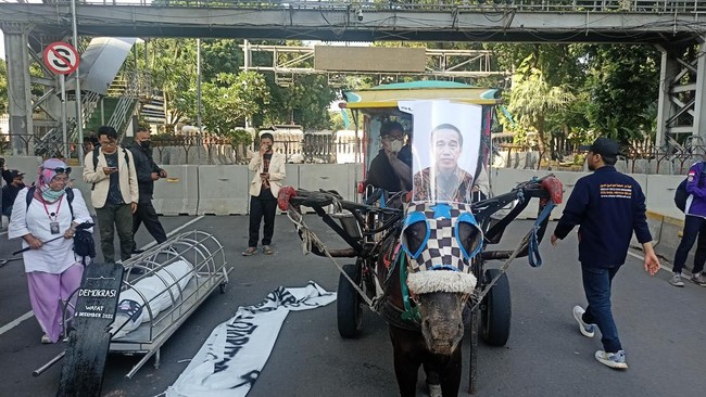 Massa mahasiswa mendatangi kawasan Patung Kuda, Jakarta Pusat, untuk melakukan demonstrasi. Mereka membawa keranda, nisan, hingga delman dengan foto Presiden Joko Widodo (Jokowi) di depannya.