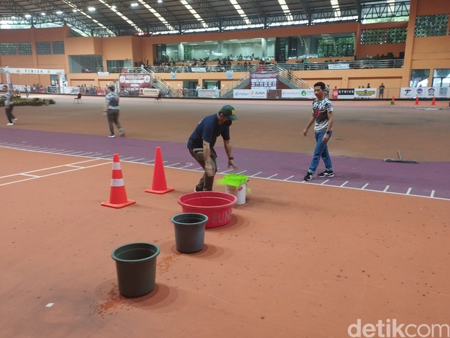 Beberapa panitia lainnya juga ikut membantu mengeringkan lintasan sepatu roda menggunakan kain pel. Terlihat juga air menetes di beberapa titik di dalam lintasan sepatu roda.