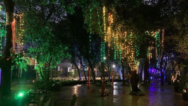 Pantauan detikcom di lokasi, Kamis (22/12/2022), rangkaian lampu warna-warni tampak menghiasi tanaman di Taman Sumenep, Jakpus. Pagar dinding pembatas jembatan di taman itu juga dipenuhi dengan lampu hias.