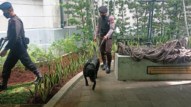 Pantauan detikcom di Gereja Katedral, Jakarta Pusat, pukul 13.20 WIB, Sabtu (24/12/2022), terlihat tim Gegana menyisir berbagai sudut gereja dengan anjing pelacak atau K9. Ada dua anjing pelacak yang dikerahkan.