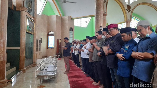 Jenazah Ridwan Saidi disalatkan di Masjid Jami Darussalamah, Bintaro, Pesanggrahan, Jakarta Selatan. Sejumlah pelayat turut menyalatkan jenazah Ridwan Saidi, salah satunya Fadli Zon.