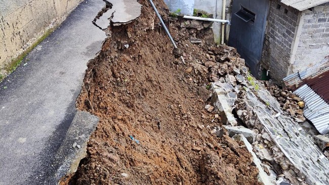 "Tanah longsor ini terjadi pada rumah milik Bapak Supandi (1 KK 5 jiwa). Posisi rumah di atas tebing, longsor pada bagian dapur dan membuat roboh tembok kamar utama," kata Theofilo.