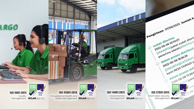 J&T Cargo menjamin kualitas layanan logistik sesuai dengan standar internasional yang lengkap dan terukur melalui sertifikasi ISO. Sertifikasi ini meliputi ISO 14001:2015 tentang manajemen lingkungan, ISO 45001:2018 tentang manajemen kesehatan dan keselamatan, ISO 9001:2015 tentang manajemen mutu, serta ISO 27001:2013 tentang manajemen keamanan informasi.