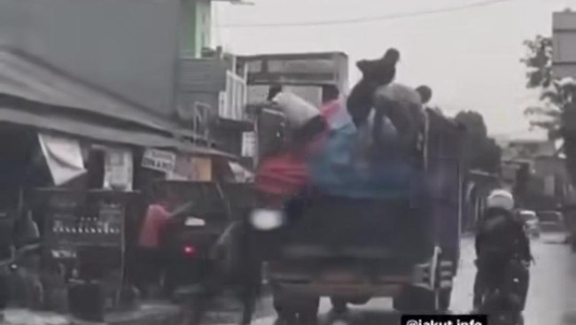 Dalam video viral yang dilihat, Jumat (30/12/2022), terlihat ada tiga orang naik ke truk yang sedang melaju di jalanan. Ketiga orang itu terlihat membuka terpal penutup truk dan mengeluarkan muatannya.