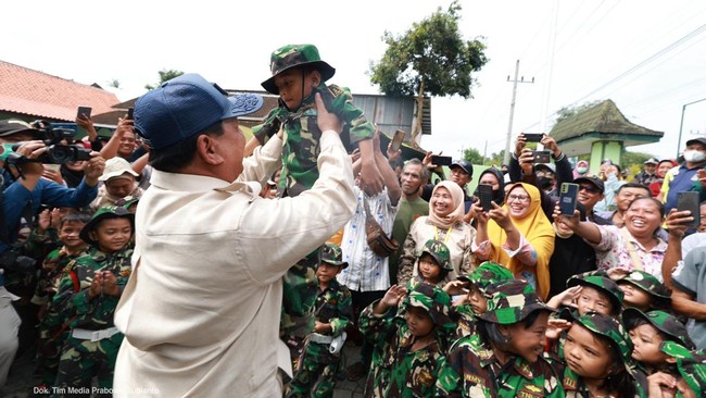 Selain itu, Prabowo memberikan hormat kepada anak-anak yang berpakaian loreng tentara serta emak-emak memancarkan tawa bahagia ketika Ketua Umum Gerindra itu menggendong anak-anak seusai pelaksanaan acara tersebut.