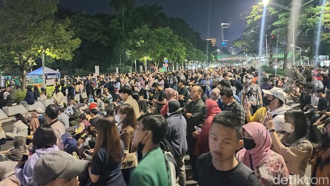 Pantauan detikcom di lokasi, Sabtu (31/12/2022) pukul 22.10 WIB, terlihat massa memenuhi ruas Jalan Jenderal Sudirman. Di kawasan tersebut sendiri didirikan panggung dengan genre pop rock.
