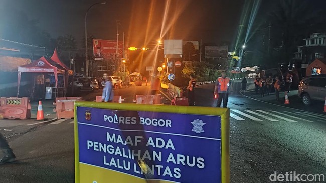 Pantauan detikcom di Simpang Gadog, Sabtu (31/12/2022) malam, petugas mulai menutup jalan menggunakan pembatas. Kendaraan yang hendak menuju kawasan Puncak terlihat dialihkan.
