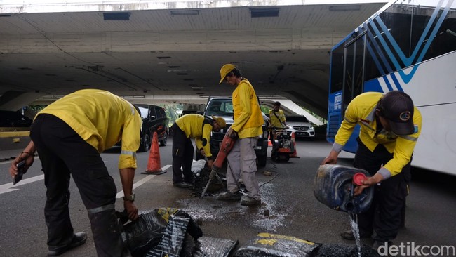 Jalanan tidak ditutup dari arus lalu lintas, namun badan jalan yang diperbaiki dibatasi dengan kerucut oranye (traffic cone). Sejumlah pasukan kuning atau pekerja Dinas Bina Marga DKI Jakarta.