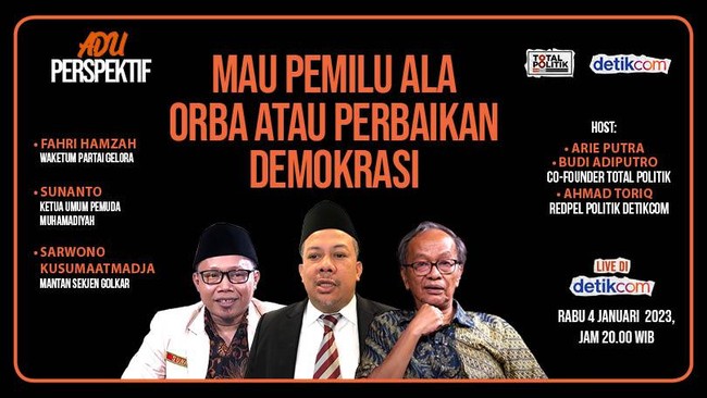 Adu Perspektif kali ini mengangkat topik 'Mau Kembali Pemilu ala Orde Baru Perbaikan Demokrasi'. Menghadirkan Fahri Hamzah (Waketum Partai Gelora), Sunanto (Ketua Umum Pemuda Muhammadiyah) dan Sarwono Kusumaatmadja (mantan Sekjen Golkar), saksikan secara langsung Adu Perspektif dari kanal detikcom dan 20detik, Rabu, 4 Januari 2023, pukul 20.00 WIB.