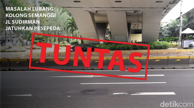 Lubang jalan di kolong Simpang Susun Semanggi telah membuat seorang pesepeda mengalami kecelakaan. Kini lubang telah ditambal. Berikut adalah perbandingan kondisi sebelum dan sesudah penanganan.