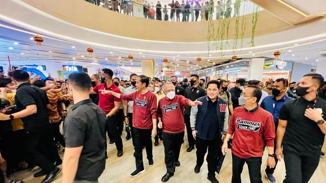 Jokowi langsung berjalan masuk untuk menyapa warga dan berswafoto di lantai dasar mal. Melihat antusiasme warga yang juga menyapa dari lantai atas, Jokowi bersama para menteri pun kemudian naik menuju lantai 1 dengan menggunakan eskalator.
