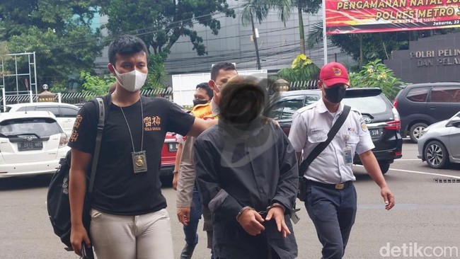 Pantauan detikcom di Polres Metro Jakarta Selatan, Kamis (5/1/2023), pelaku berjalan menunduk saat dibawa masuk ke dalam kantor polisi. Tangannya terlihat diborgol.